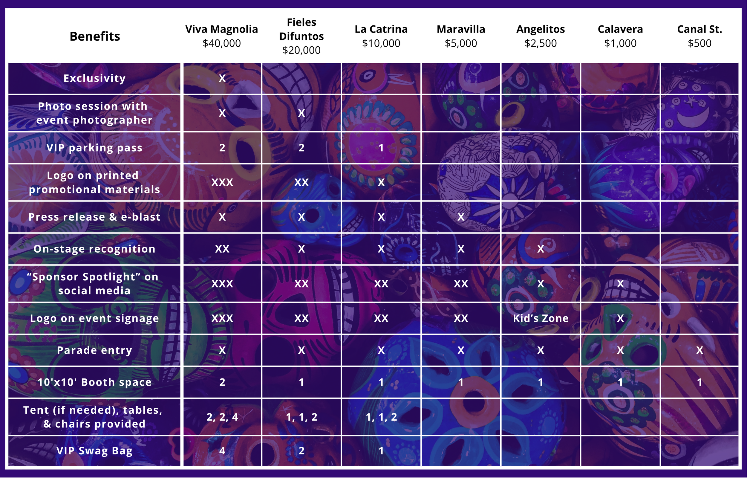 Email and Website: Sponsorship announcement with other La Catrina Sponsors to our 400+ email list and recognition on home and post-event website pages